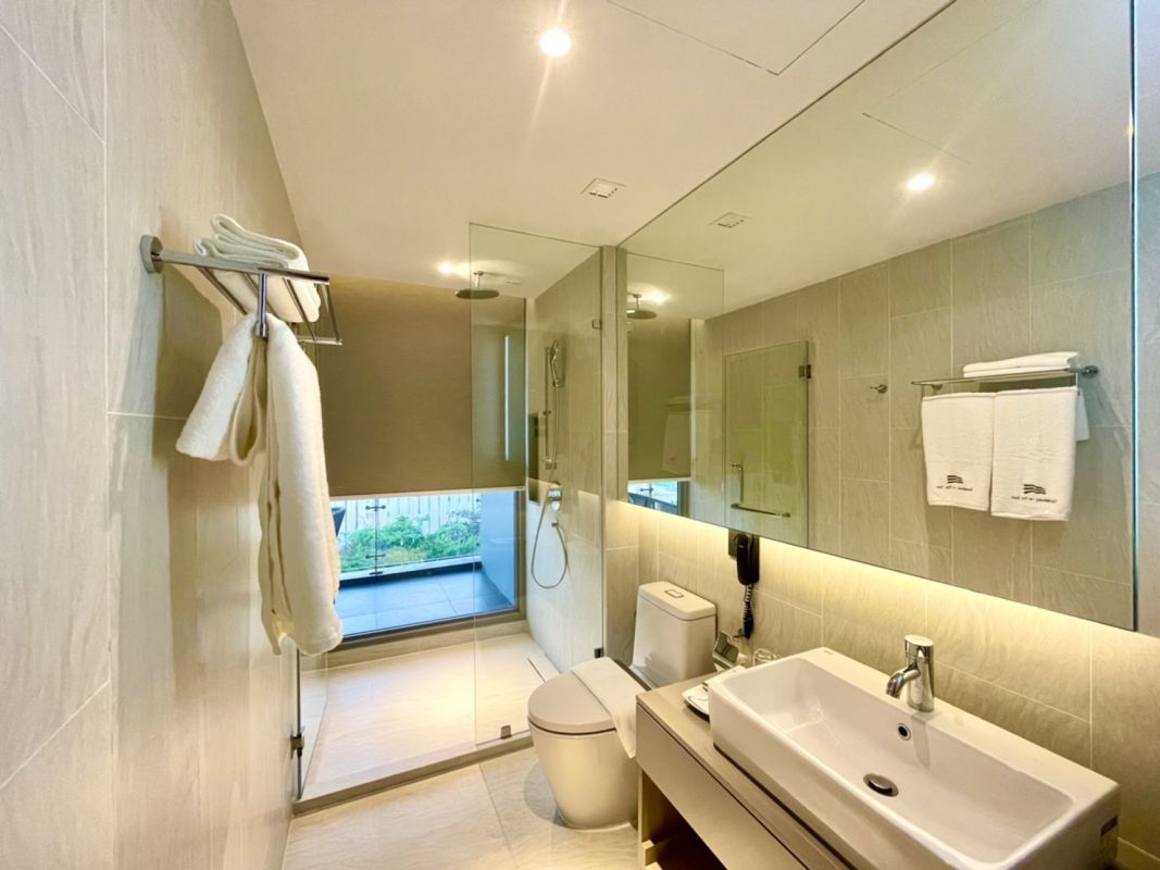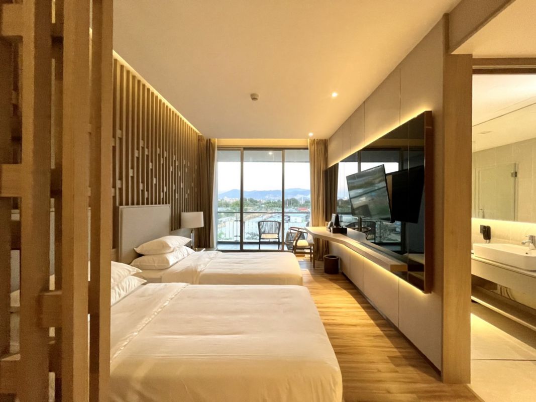 Views that stretch for sea. This double room features a balcony, electric kettle and spa bath.